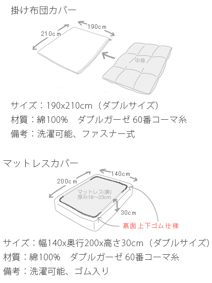 サイズ: 190×210cm(ダブルサイズ) 材質: 綿100% ダブルガーゼ 60番コーマ糸 備考: 洗濯可能、ファスナー式 サイズ: 幅140×奥行き200×高さ30cm(ダブルサイズ) 材質: 綿100% ダブルガーゼ 60番コーマ糸 備考: 洗濯可能、ゴム入